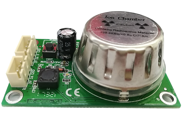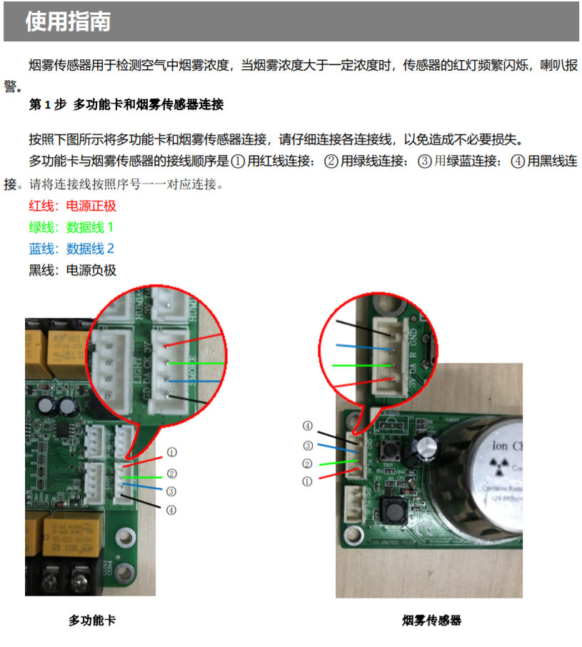 烟雾传感器用于检测空气中烟雾浓度,当烟雾浓度大于一定浓度时,传感器的红灯频繁闪烁,喇叭报警。
