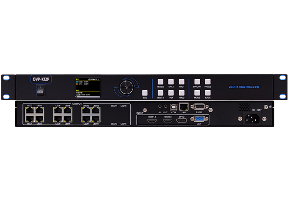 OVP-K12P面向大型酒店、高端会议、酒吧KTV等应用领域,支持2画面显示和任意布局。支持4Kx2K@60Hz图像处理和拼接。设备集成12千兆网口大发送,支持4K点对点输出,支持LED显示屏的远程维护。
